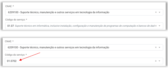 - O campo Código de serviço, associado ao CNAE da empresa, agora pode ser preenchido manualmente, conforme exigido pela prefeitura de Gramado (RS), no formato de serviço desdobrado. Exemplo: o padrão anterior 07, já cadastrado no sistema, pode ser complementado pelo novo formato desdobrado 01.0702, quando este não estiver previamente disponível na lista.