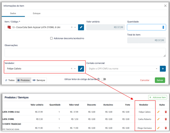 - Novos campos Vendedor e Contato comercial foram adicionados à tela Informações do item, permitindo vincular essas informações por item inserido na venda, seguindo o mesmo conceito aplicado nos PDVs Desktop.