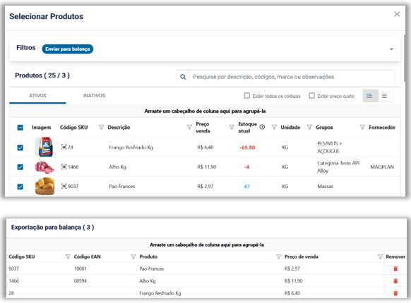 - Exportar dados para balança – Validação dos itens selecionados para exportação do arquivo .TXT. O sistema exportava todos os itens marcados como Enviar para balança, ignorando a seleção feita pelo usuário.