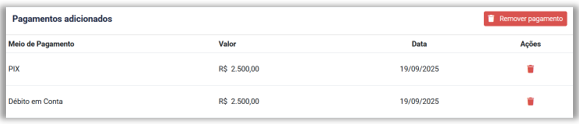 - Novo ícone de exclusão disponibilizado ao lado da forma de pagamento, na coluna Ações. Utilizando esta função apenas um pagamento vinculado será excluído, não interferindo nos demais. O botão Remover pagamentos continua disponível em tela para deletar todos os pagamentos de uma só vez.