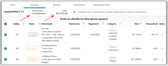 - Totalizador de quantidade e valor total dos lançamentos selecionados inserido ao lado do campo de pesquisa.
