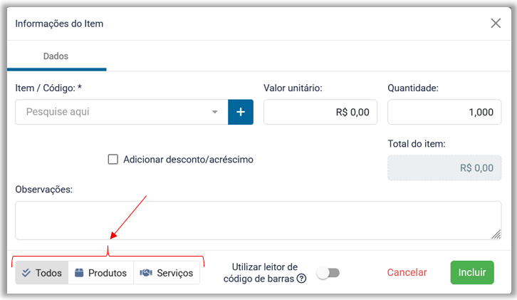 - Novos filtros Todos, Produtos e Serviços disponibilizados na tela ao adicionar/editar itens para facilitar a busca por itens ou serviços.