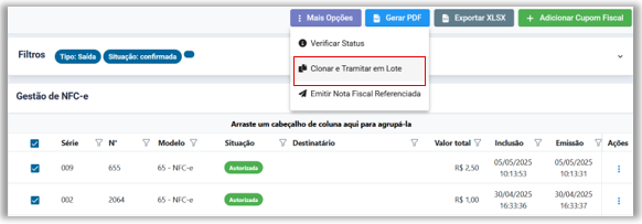 - Clonar e Tramitar em Lote – Nova funcionalidade disponibilizada para clonar e emitir notas fiscais em lote. É possível realizar este procedimento para emitir NF-e, NFC-e e NFS-e. Para pedidos de venda/orçamentos apenas a função clonar (sem emissão) foi implementada.