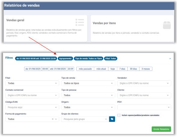 - Relatórios > Vendas > Vendas geral – Este novo relatório permite visualizar todas as vendas ajustando filtros de forma personalizada, ajustando os parâmetros de busca de acordo com a necessidade do usuário.