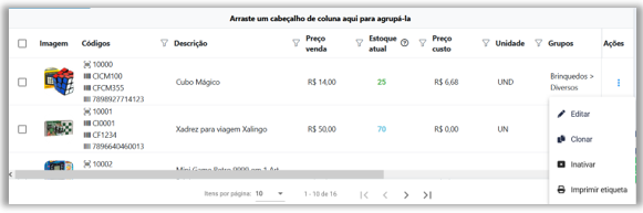 - Ações – Ajuste na validação do perfil de acesso do usuário logado. O menu com as opções Editar, Clonar, Inativar, Imprimir etiqueta não estava sendo exibido, em cenários específicos de acordo com os acessos habilitados.