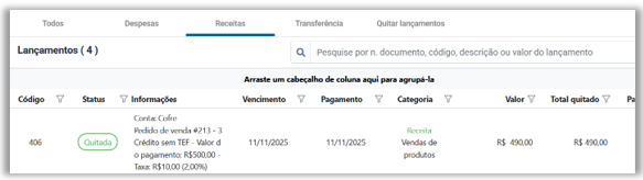 - A coluna Valor total quitado estava apresentando o valor R$ 0,00 mesmo com a receita já quitada.