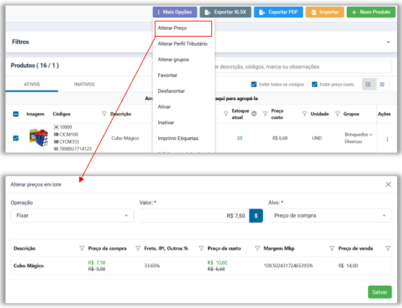 - Margem MKP – O valor do percentual será recalculado sempre que houver alteração nos preços de compra, venda ou Frete, IPI, Outros%.