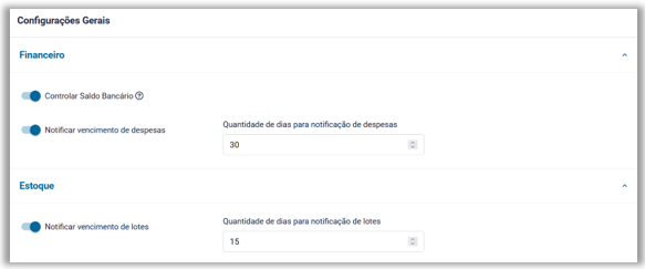 - Configurações > Configurações gerais – Prazo para exibição das notificações de vencimento de despesas e vencimento de lotes poderá ser configurado conforme necessidade do usuário.