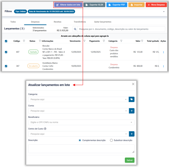 - Alterar dados em lote – Esta nova função permite alterar Categoria, Conta, Beneficiário, Centro de custo e Descrição de vários lançamentos financeiros simultaneamente.