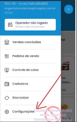 - Acessar o app PDV POS, ir em "MENU" -> "CONFIGURAÇÕES".