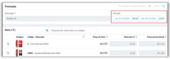 - Vendas > Promoção – Correção no horário de término da promoção, que permanecia fixo às 00:00 da data selecionada, causando falha na aplicação do desconto durante o período promocional.