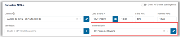 - Novo campo Intermediário na tela de emissão da nota fiscal de serviço. O usuário pode cadastrá-lo diretamente na tela, clicando em + (Adicionar) ou pelo menu lateral Vendas > Contatos comerciais.