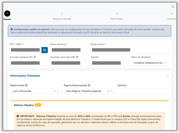 - Nova área de configurações fiscais em adequação à reforma tributária - Somente para empresas de regime normal (lucro real ou presumido). Nela, é possível visualizar e configurar o perfil tributário da empresa conforme as operações de compra, venda e prestação de serviços, além de informar CST IBS/CBS e Classificação tributária ICS/CBS com as respectivas alíquotas. Consulte a contabilidade para garantir a inserção correta das informações.