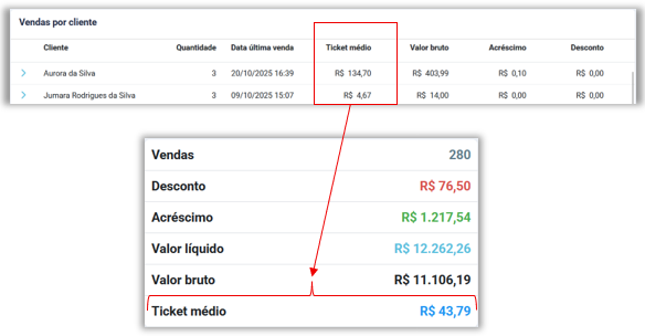 - Vendas > Vendas por Clientes – Nova coluna Ticket médio no relatório em tela, nos totalizadores e na exportação dos arquivos .PDF e .XLSX.