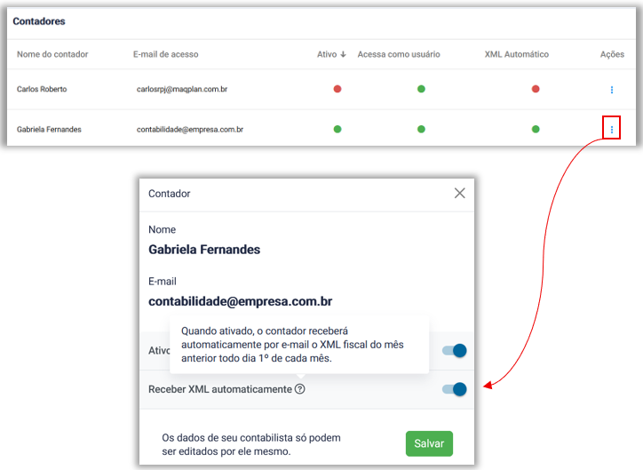 - Contábil – Nova configuração disponibilizada no cadastro do contador, permitindo que o ERP envie automaticamente ao e-mail cadastrado o XML das notas emitidas no mês anterior.