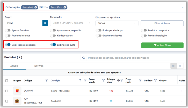 - Produtos – Exibição aprimorada da lista de produtos, mostrando tags de ordenação e filtros aplicados. Opção para exibir SKUs, códigos internos e preço de custo.