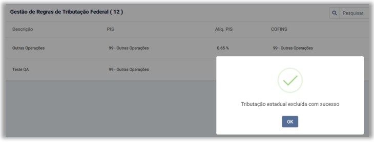 - Tributos Federais - Correção de erro ao excluir código de tributação. Anteriormente o sistema exibia notificação com mensagem técnica e mantinha o cadastro na lista Gestão de Regras de Tributação Federal.